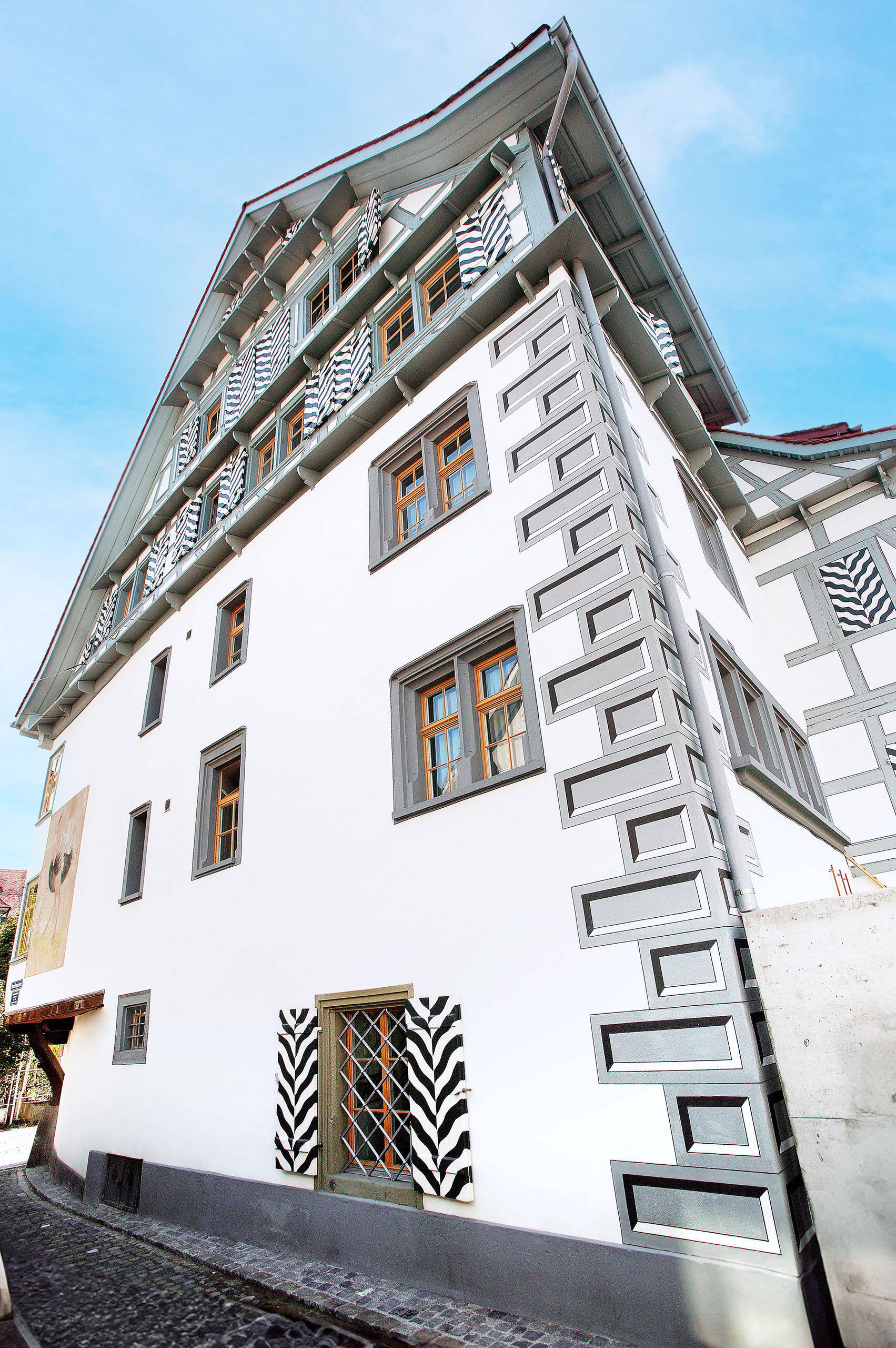 Das historische Gebäude in der St.Galler Altstadt wurde 1540 erstmals urkundlich erwähnt. Bei der umfassenden Renovation führten wir in Zusammenarbeit mit der Denkmalpflege die Malerarbeiten aus und verhalfen der Fassade zu neuer Pracht. Die historischen Dekorationselemente wurden fachgerecht schabloniert und von Hand liniert.