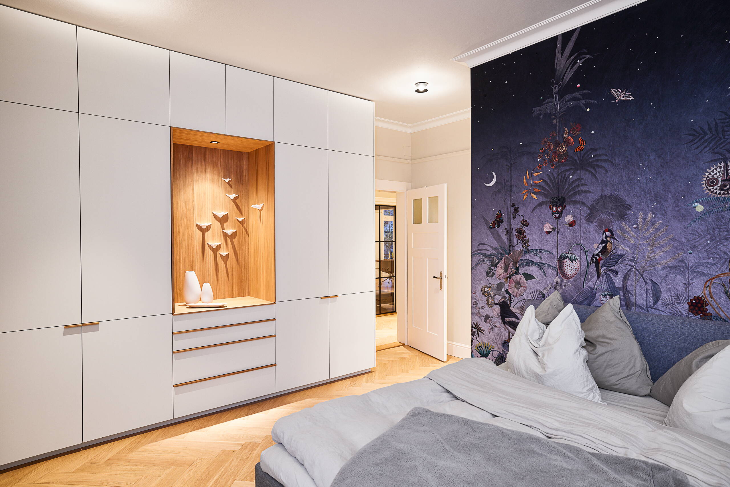 Jugendstil trifft Nordisches Design. In Rekordzeit wurde diese Wohnung umgebaut, die in der Textilblüte vor rund 110 Jahren entstand. Der Charakter blieb erhalten, moderne Farben bringen neue Energie ins Haus. Im Schlafzimmer wurde die grossflächige Tapete "Poppy Zephyre" von Jakob Schläpfer angebracht, das wohl auffälligste Designelement der Renovation.