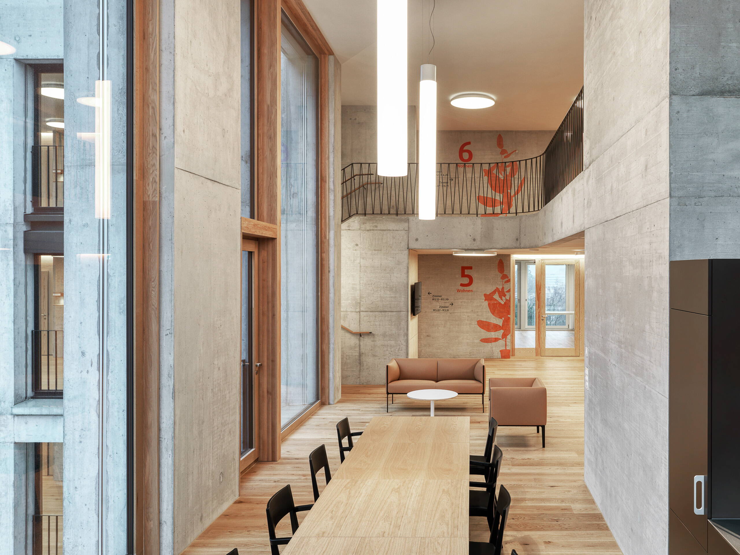Beim Neubau des Marthaheims kam Sichtbeton als prägendes architektonisches Element zum Einsatz. Die Martin Hanimann AG wurde mit der künstlerischen Ausgestaltung der Betonflächen beauftragt und brachte florale Motive in sorgfältiger Schablonentechnik auf. Die kräftigen Farbtöne setzen nicht nur lebendige Akzente, sondern tragen auch zur besseren Orientierung innerhalb des Gebäudes bei.